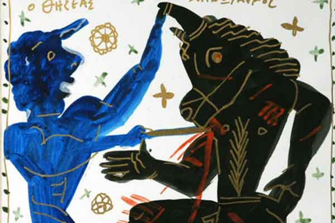 Ο μεν Μινώταυρος έχει μορφή ταύρου, πράγμα που παραπέμπει τόσο στις ταυροκαθαψίες όσο και στους ισπανικούς ταύρους της αρένας που τόσο αγάπησαν οι καλλιτέχνες του μοντερνισμού γύρω στη δεκαετία του ΄20. Ο δε Θησέας δεν έχει την παραμικρή αχλύ που περιβάλλει τον ήρωα, ούτε καν τον αισθησιασμό που σίγουρα προσέλκυσε την Αριάδνη. Αντιθέτως, μοιάζει με λαϊκό πρόσωπο του Θεάτρου Σκιών, ένα τρομαγμένο παιδί εμπρός στους μυκηθμούς του θηρίου…».