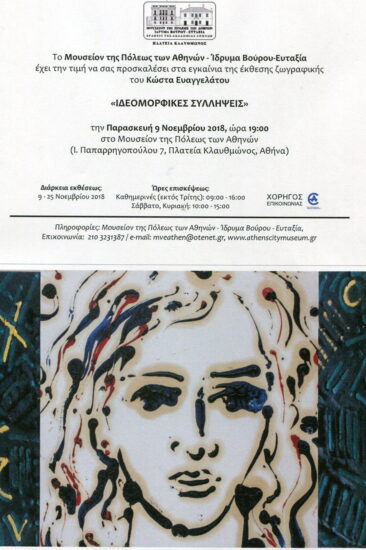 Τα εγκαίνια της νέας έκθεσης του Κώστα Ευαγγελάτου με τίτλο «Ιδεομορφικές Συλλήψεις», γίνονται την Παρασκευή 9 Νοεμβρίου 2018, ώρα 7μμ. στο Μουσείον της Πόλεως των Αθηνών, Ι. Παπαρρηγοπούλου 7 στην Πλατεία Κλαυθμώνος.