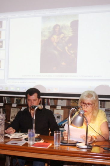 Στη συνέχεια ο Κώστας Ευαγγελάτος μίλησε αυθόρμητα και κατατοπιστικά για την ποιητική έμπνευση του από τα έργα των δύο μεγάλων καλλιτεχνών, του Λεονάρντο Ντα Βίντσι και της Αρτεμισίας Τζεντιλέσκι, που είχε την τύχη και τη δυνατότητα να μελετήσει σε αναδρομικές εκθέσεις έργων τους σε σε μεγάλα Μουσεία στο Παρίσι. Αναφέρθηκε στο πνεύμα της Αναγέννησης και των μεγάλων της επιτεύξεων της εποχής που αναβάπτισε τα αρχαία μοτίβα και καθόρισε την φυσιοκρατική οπτικοποίηση των θρησκευτικών θεμάτων (Leonardo) και στον κόσμο του ύστερου Μπαρόκ, εποχής των συναισθηματικών ακραίων εξάρσεων και της βαριάς και επιβλητικής φόρμας των συνθέσεων (Artemisia).