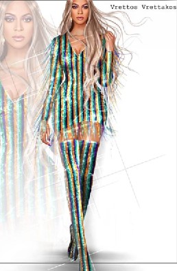 Η Βασίλισσα της Pop φοράει μία ολοκέντητη κρυστάλλινη Haute Couture δημιουργία με 450.000 κρύσταλλα, στα χρώματα της Αφρικής. Πορτοκαλί, τιρκουάζ, σμαραγδί και βιολετί συνδυάζονται σε ένα εντυπωσιακό καλειδοσκόπιο χρωμάτων που μαγνητίζουν το βλέμμα και αποτυπώνουν τον πλούτο του Αφρικανικού πολιτισμού.