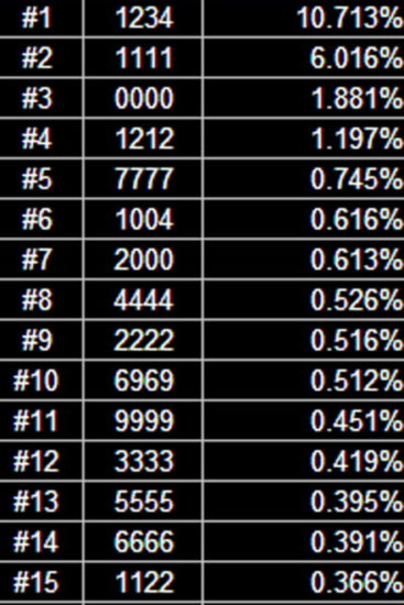 Μπορείτε, λοιπόν, να μαντέψετε ότι ο πρώτος στη λίστα είναι ο αριθμός 1234, τον οποίο χρησιμοποιεί σχεδόν το 11% των κατόχων καρτών για ΑΤΜ!