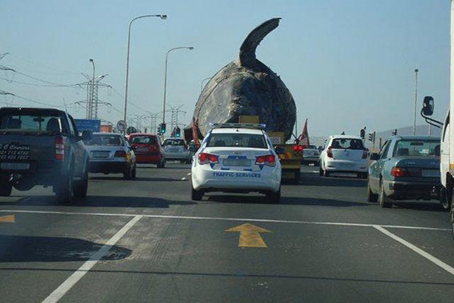 Ενώ οδηγείς αμέριμνος και κοιτάς μπροστά, ξαφνικά η συνηθισμένη εικόνα των οχημάτων διακόπτεται από κάτι που δεν περίμενες να δεις στη μέση του δρόμου: το κουφάρι μιας τεράστιας φάλαινας!
