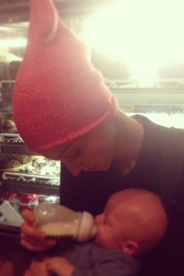Είναι η πρώτη φορά που μπορούμε να δούμε και το προσωπάκι του, το οποίο η ίδια η Σοφία Καρβέλα άφησε να φανεί στον φακό, ενώ επίσης τη βλέπουμε σε μια έξοδό τους, να του δίνει το γάλα του.