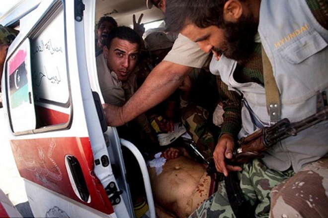 O Gaddafi σκοτώθηκε το πρωί της 20ης Οκτωβρίου, ενώ μετέβαινε στη γενέτειρά του Σύρτη. Η σορός του συνταγματάρχη ήταν μέχρι τις 24 Οκτωβρίου εκτεθειμένη σε ψυγείο κρεάτων στη Μισράτα, όπου συγκεντρώθηκαν πολλοί κάτοικοι της περιοχής, φωτογραφίζοντας τα πτώματα του ίδιου και του γιου του.