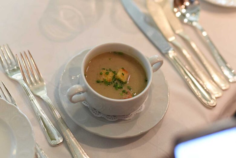 Λευκή ψαρόσουπα με σχοινόπρασο, σκορδάτα κρουτόν και σάλτσα “Harissa”
