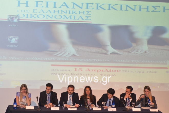 Έξι νέοι επαγγελματίες από διαφορετικούς τομείς της οικονομίας-Ναυτιλία, Τράπεζες, Επενδύσεις, Εμπόριο, Παιδεία, Βιομηχανία– οι κ.κ Ερρίκος Αρώνες, Αλέξανδρος Κίκιζας,Χριστίνα Πλακόπητα, Μιλένα Παππά, Χάρης Δασκαλάκης και Σπύρος Τσίλογλου, με συντονίστρια τη δημοσιογράφο οικονομικών θεμάτων της “The Wall Street Journal” Ματίνα Στέβη, τοποθετηθηκαν στο ζήτημα της επανεκκίνησης της ελληνικής οικονομίας μέσω της τόνωσης της επιχειρηματικότητας και της προάσπισης του εθνικού συμφέροντος.