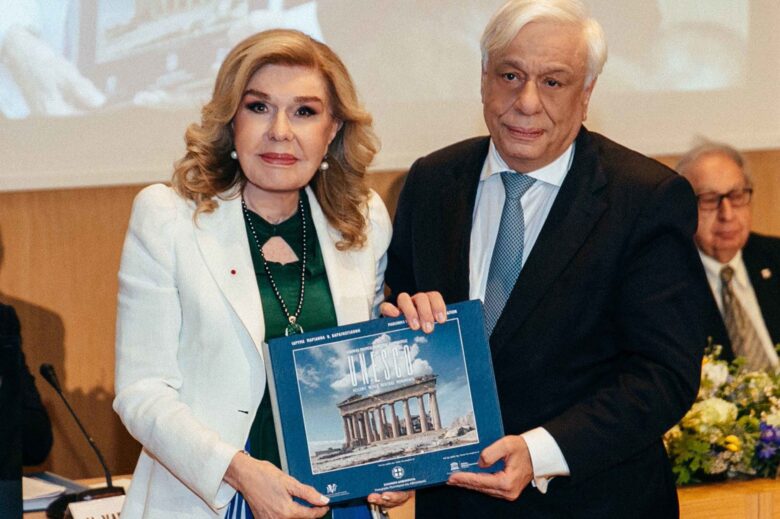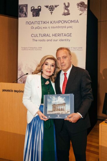 Αμέσως μετά η κυρία Βαρδινογιάννη επέδωσε το πρώτο αντίτυπο του λευκώματος για τα Μνημεία Παγκόσμιας Κληρονομιάς στον Πρόεδρο της Δημοκρατίας. Ο Πρόεδρος της Δημοκρατίας στον χαιρετισμό του συνεχάρη την κυρία Μαριάννα Β. Βαρδινογιάννη για την πρωτοβουλία έκδοσης ενός λευκώματος για τα ελληνικά Μνημεία Παγκόσμιας Κληρονομιάς και υπογράμμισε ότι η έκδοση αυτή συνιστά εμβληματική συμβολή στην ανάδειξη και στην υπεράσπιση του πολιτισμού μας, τόσο του ελληνικού, όσο και του ευρωπαϊκού, του οποίου ο ελληνικός πολιτισμός αποτελεί αναντικατάστατη αντηρίδα. Στο πλαίσιο αυτό, επισήμανε, ότι μεταξύ των μνημείων της ελληνικής αρχαιότητας, που συνθέτουν τον πυρήνα της όλης πολιτιστικής μας κληρονομιάς, κορυφαία θέση κατέχει ο Παρθενώνας, καθώς συμβολίζει, με ανεπανάληπτο τρόπο, την αφετηρία και την κοιτίδα του εν γένει δυτικού πολιτισμού, συγκεκριμένα δε την αφετηρία και την κοιτίδα τόσο των πνευματικών μας καταβολών όσο και των θεσμικών πυλώνων της Δημοκρατίας μας. Στην συνέχεια τόνισε την ανάγκη άμεσης επιστροφής των Γλυπτών του Παρθενώνα.