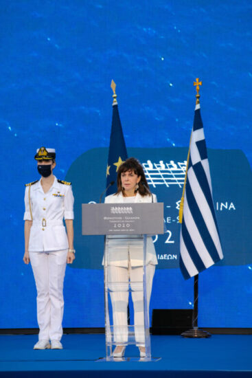 Η έναρξη της εκδήλωσης με τους 21 κανονιοβολισμούς που προβλέπει το πρωτόκολλο για την άφιξη της Α.Ε. της Προέδρου της Δημοκρατίας, το τιμητικό άγημα που ήταν παραταγμένο μπροστά από το εμβληματικό κτίριο του Διοικητηρίου της Σχολής Ναυτικών Δοκίμων καθώς και οι μελωδίες της Mπάντας του Πολεμικού Ναυτικού, υπό τη διεύθυνση του Μαέστρου Πλωτάρχη Γεώργιου Τσιλιμπάρη, δημιουργούσαν μια μεγαλοπρεπή ατμόσφαιρα.