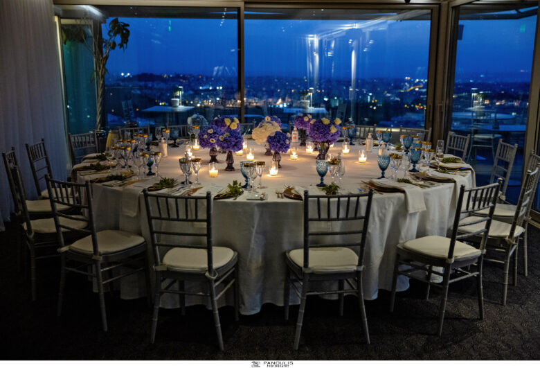 Το art de la table επιμελήθηκε η Antoinette Koutsouradi με μία εντυπωσιακή σύνθεση σε vintage βάζα μπλέ-γκρί απόχρωσης με ορτανσίες στο μπλε της θάλασσας και πινελιές από λευκούς λυσίανθους, περιτριγυρισμένα από κεριά.