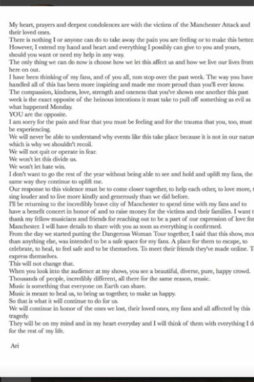Μία εβδομάδα μετά την τρομοκρατική επίθεση σε συναυλία της στο Manchester Arena, η Αμερικανή τραγουδίστρια εξέφρασε τη βαθιά οδύνη της για τα θύματα και τις οικογένειές τους σε ένα μήνυμα που ανάρτησε στον λογαριασμό της στο Instagram, υπογραμμίζοντας πως δεν πρέπει να αφήσουμε το μίσος να κερδίσει.