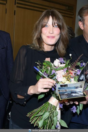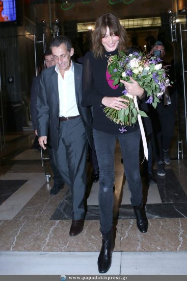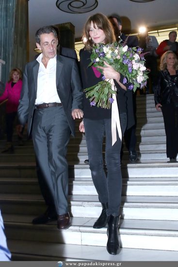 Χαμογελαστοί και ευδιάθετοι βγήκαν από το θέατρο Παλλάς η Κάρλα Μπρούνι και ο Νικολά Σαρκοζί αμέσως μετά τη συναυλία της πρώην πρώτης κυρίας της Γαλλίας , η οποία γνώρισε τεράστια επιτυχία.