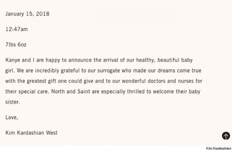 Για τη χαρμόσυνη είδηση του ερχομού του τρίτου τους παιδιού, οι ευτυχισμένοι γονείς εξέδωσαν ανακοίνωση στα διεθνή μέσα. «Ο Kanye και εγώ (Kim Kardashian) με πολύ χαρά σας ανακοινώνουμε τον ερχομό της υγιέστατης και όμορφης κόρης μας. Είμαστε ευγνώμονες στην παρένθετη μητέρα, η οποία έκανε το όνειρό μας πραγματικότητα, δίνοντάς μας το πιο υπέροχο δώρο. Η North και ο Saint είναι εκστασιασμένοι για τον ερχομό της αδερφής τους».