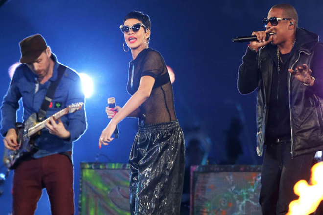 Αργότερα άλλαξε φορώντας ένα διαφανές top και λαμπερή μαύρη φούστα. Η τραγουδίστρια από τα Barbados τραγούδησε σε ντουέτο με Chris Martin το “Princess of China”πριν ερμηνεύσει την επιτυχία της “We Found Love”. Λίγο πιο μετά ο rapper Jay–Z τους συνάντησε στη σκηνή τραγουδώντας το επιτυχημένο single του, “Run This Town” (χωρίς τον Kanye West).