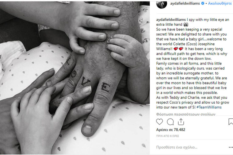 “Λοιπόν, σας κρατούσαμε ένα πολύ ξεχωριστό μυστικό! Με μεγάλη χαρά σας ανακοινώνουμε πως αποκτήσαμε ένα κοριτσάκι… Μόλις καλωσορίσαμε στον κόσμο την Colette (Coco) Josephine Williams! Ήταν ένας δύσκολος δρόμος… μέχρι να φτάσουμε εδώ, γι’ αυτό τον λόγο το κρατήσαμε σε χαμηλούς τόνους. Η οικογένεια έρχεται σε διάφορες μορφές και αυτή εδώ η μικρή κυρία είναι βιολογικά δική μας αλλά κυοφορήθηκε από μία υπέροχη παρένθετη γυναίκα, στην οποία θα χρωστάμε ευγνωμοσύνη για πάντα. Είμαστε ενθουσιασμένοι που ήρθε η μικρή στις ζωές μας και νιώθουμε τεράστια χαρά που ζούμε σε έναν κόσμο που το έκανε πιθανό. Μαζί με την Teddy και τον Charlie, σας παρακαλούμε να σεβαστείτε την ιδιωτικότητα της Coco και να μας επιτρέψετε να μεγαλώσουμε την 5μελή ομάδα μας”.