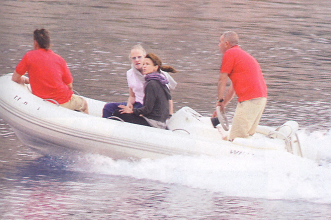 Τελικά, λόγω της αυξημένης κίνησης έριξε άγκυρα στα δεξιά του λιμανιού και η Σοφί Μαρσό με τον σύζυγό της Κριστόφ Λαμπέρ, έφτασαν στο νησί του Αργοσαρωνικού με φουσκωτό σκάφος.