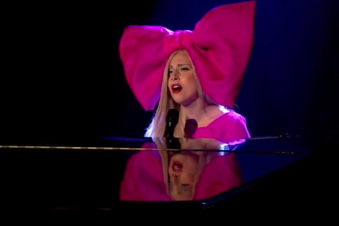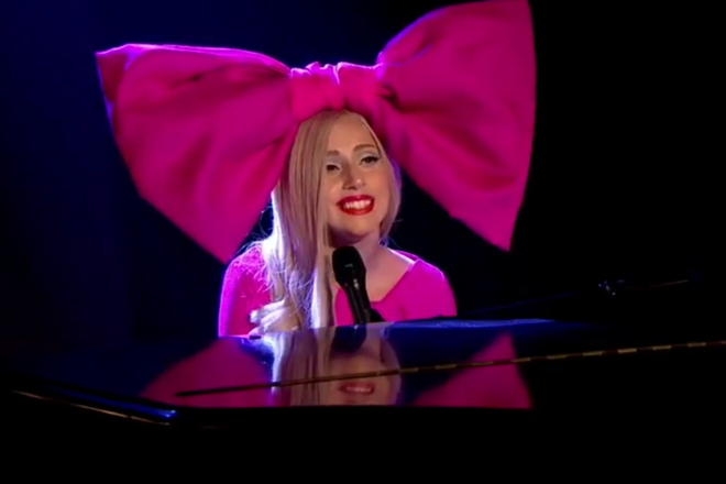 Αμέσως μετά τη συνέντευξη, η Lady Gaga άλλαξε ρούχα και φόρεσε ένα ροζ φόρεμα με ένα μεγάλο ροζ φιόγκο στο κεφάλι και έπαιξε το νέο της hit στο πιάνο.