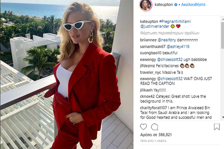 Συγκεκριμένα, η εντυπωσιακή, Kate Upton πόζαρε από το μπαλκόνι της στο Μαϊάμι, με ένα κόκκινο κουστούμι, εντυπωσιακό ντεκολτέ και με την φουσκωμένη κοιλίτσα ίσα που να διαγράφεται γράφοντας στο Instagram: «έγκυος στο Μαϊάμι».