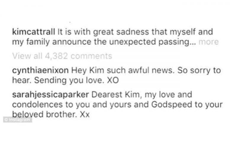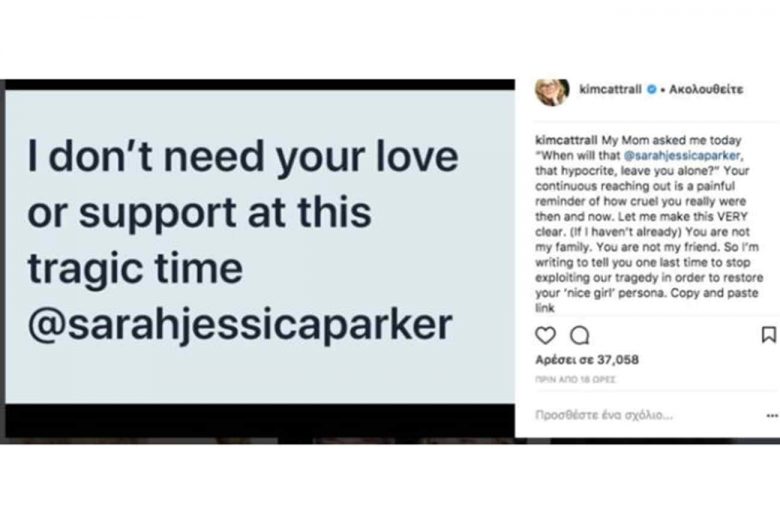 Το συλλυπητήριο, ωστόσο, μήνυμα που έλαβε από την Sarah Jessica Parker και έγραφε: «Αγαπητή Κιμ, η αγάπη μου και τα συλλυπητήριά μου σε εσένα και τους δικούς σου για το θάνατο του αγαπημένου σου αδερφού», εξόργισε την Kim Cattrall, η οποία ξέσπασε εναντίον της με ένα post στο Instagram που έγραφε: «Δε χρειάζομαι την αγάπη ή την υποστήριξή σου σε αυτή την τραγική για μένα περίοδο Sarah Jessica Parker».