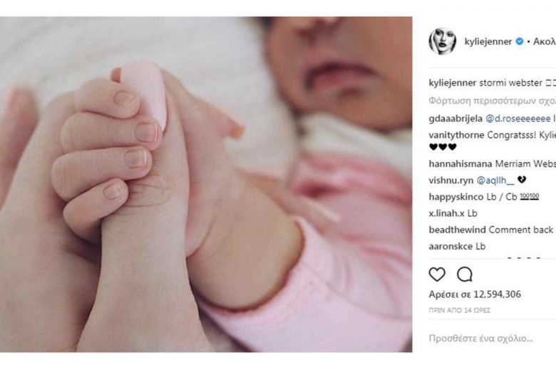 Συγκεκριμένα, η Kylie Jenner ανέβασε μια φωτογραφία στην οποία φαίνεται το μισό προσωπάκι και το χέρι κόρης της, να κρατά σφιχτά το δάχτυλο της μαμάς της. «Stormi webster» έγραψε η 20χρονη reiality star στη λεζάντα της φωτογραφίας, αποκαλύπτοντας έτσι και το όνομα που θα δώσει στη μικρή της.
