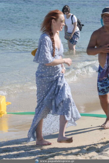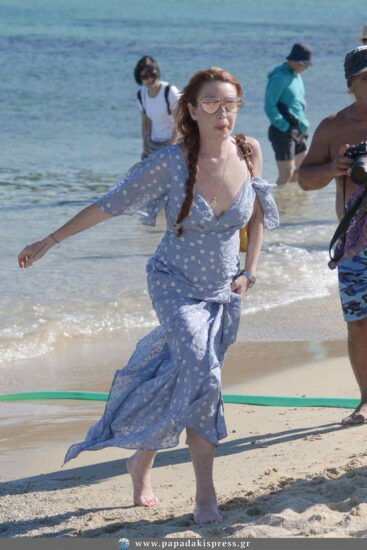 Η διάσημη ηθοποιός, έχοντας πλέον επεκτείνει και τις επιχειρηματικές της δραστηριότητες στην Ελλάδα και με το καινούργιο της beach bar στη Μύκονο, συνδυάζει δουλειές και διασκέδαση. Ο φωτογραφικός μας φακός την εντόπισε στο Καλό Λιβάδι, να φορά ένα αέρινο, καλοκαιρινό μπλέ φορεματάκι, ενώ μας κοιτά μέσα από τα γυαλιά ηλίου σε σχήμα καρδιάς.