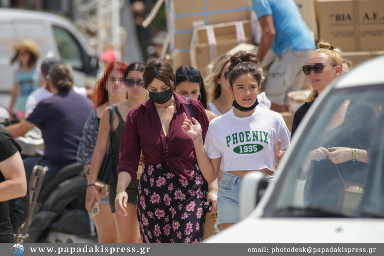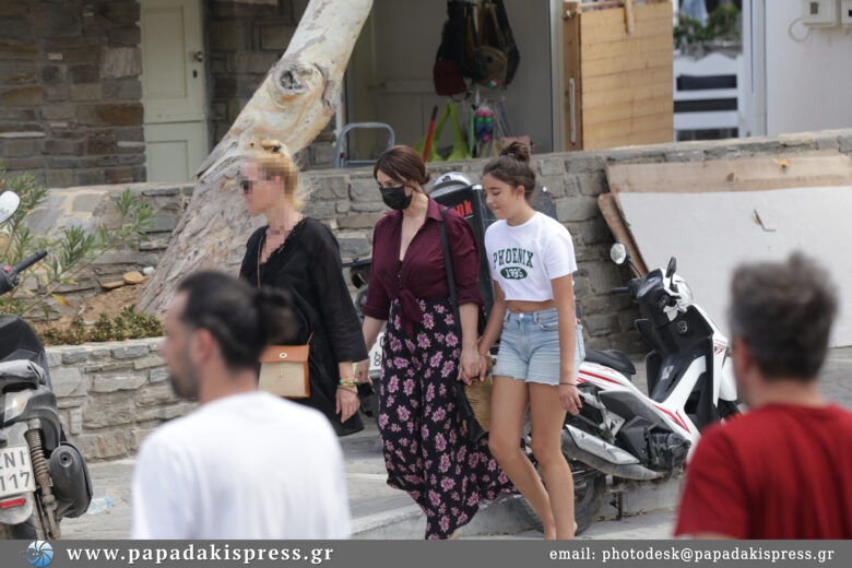 Ο φωτογραφικός φακός μας την εντόπισε στη Νάουσα μαζί με την 15χρονη κόρη της και φίλους να περπατάει στα σοκάκια του νησιού.