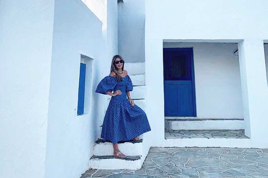 Επισκεπτόμενη για δεύτερη συνεχόμενη φορά την πατρίδα μας, μετά την περσινή της παραμονή στην Μύκονο, δηλώνει ενθουσιασμένη και δεν κρύβει το πόσο απολαμβάνει την Ελλάδα. Άλλωστε κάνει συνεχώς αναρτήσεις από τις διακοπές της, με τελευταία της ανάρτηση στην Αντίπαρο, όπου ποζάρει χαρούμενη δίπλα σε μια πανέμορφη βουκαμβίλια, αλλά και στα παραδοσιάκά νησιώτικα σπίτια με τα μπλε παράθυρα και ασορτί μπλε φόρεμα.