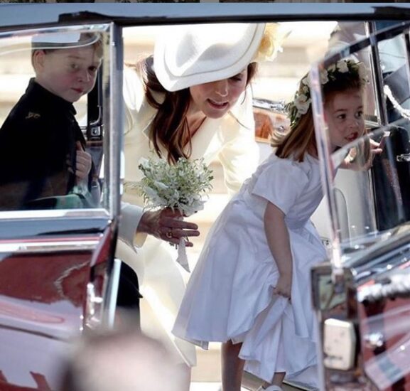 Η νύφη παρουσιάστηκε με ένα vintage φόρεμα διακοσμημένο με διαμαντένιες λεπτομέρειες που είχε σχεδιάσει ο Νόρμαν Χάρτνελ για τη βασίλισσα Ελισάβετ , ώστε με αυτό να εμφανιστεί στην πρεμιέρα της ταινίας «Λόρενς της Αραβίας» στο Λονδίνο το 1962. Παράλληλα, η βασίλισσα Ελισάβετ  δάνεισε και την τιάρα που φορούσε η ίδια στον γάμο της με τον πρίγκιπα Φίλιππο.