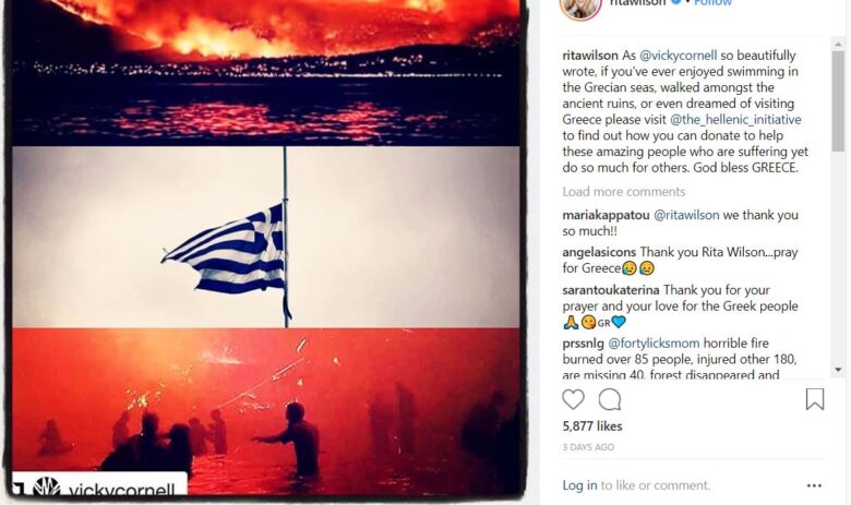 Με αυτό, η ηθοποιός απευθύνει έκκληση σε «όσους απόλαυσαν ποτέ το κολύμπι στις ελληνικές θάλασσες», «θαύμασαν τα αρχαία ερείπια στην Ελλάδα» ή έχουν απλώς ως όνειρο να επισκεφθούν την χώρα μας, να επισκεφθούν τον λογαριασμό του The Hellenic Initiative, για να κάνουν μια δωρεά για τα θύματα της καταστροφής. Και η Rita Wilson κατέληξε με την ευχή: «Ο Θεός να ευλογεί την Ελλάδα».