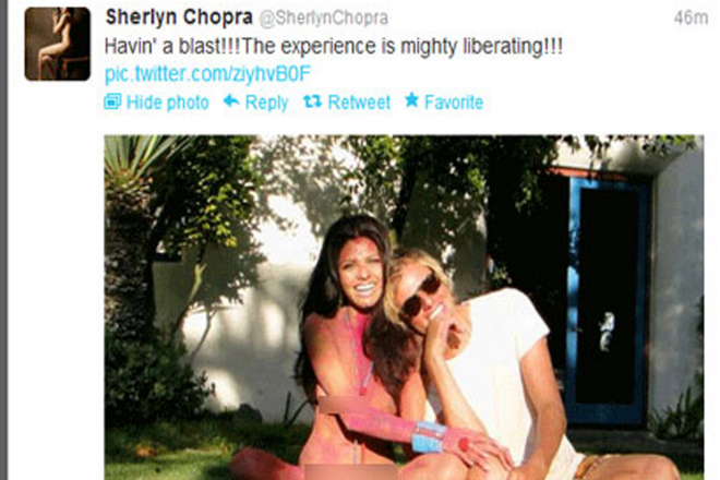 Ο ενθουσιασμός της νεαρής σταρ του Μπόλιγουντ ήταν τόσο μεγάλος που χθες (Πέμπτη 26/7) το βράδυ ανέβασε στο twitter της γυμνές εικόνες από τα παρασκήνια της φωτογράφησής της για το περιοδικό. Η Sherlyn, περιχαρής και όπως τη γέννησε η μαμά της ποζάρει με τον φωτογράφο και τον κομμωτή της οι οποίοι είναι ντυμένοι και αντιμετωπίζουν την όλη κατάσταση σαν… άλλη μια μέρα στη δουλειά.