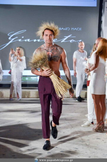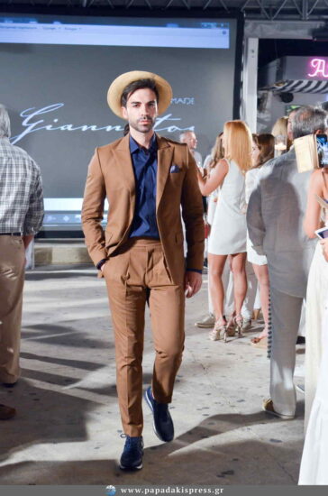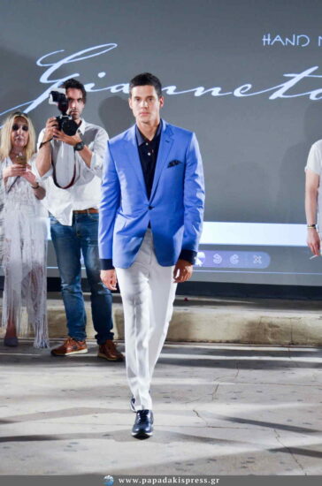 Δροσερά καλοκαιρινά υφάσματα, χρώματα ανοιχτά μπλε και παλ γκρι, καπέλα panama, headpieces από σιτάρι και μεταξωτά χειροποίητα φουλάρια συμπλήρωσαν το Summer Chic Style της διάσημης υπογραφής του Τάκη Γιαννέτου. Ο σχεδιαστής έχει παρουσιαστεί από την Ιταλική Vogue ως η επιτομή του ελληνικού χειροποίητου ανδρικού ενδύματος. Ένας τίτλος που μεταφράζεται στη μετουσίωση των 110 και πλέον χρόνων του ιστορικού οίκου Giannetos του οποίου ηγείται και οδηγεί σε διεθνή πορεία.