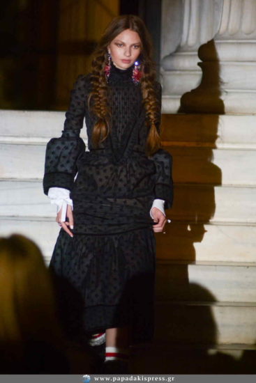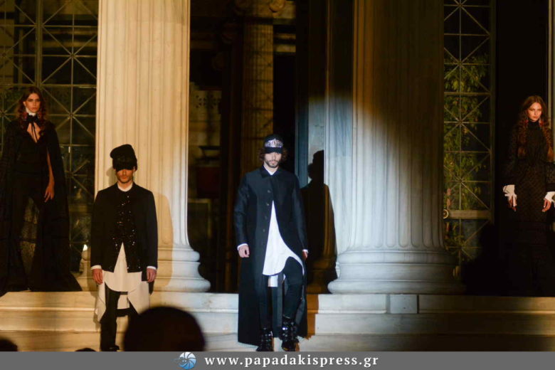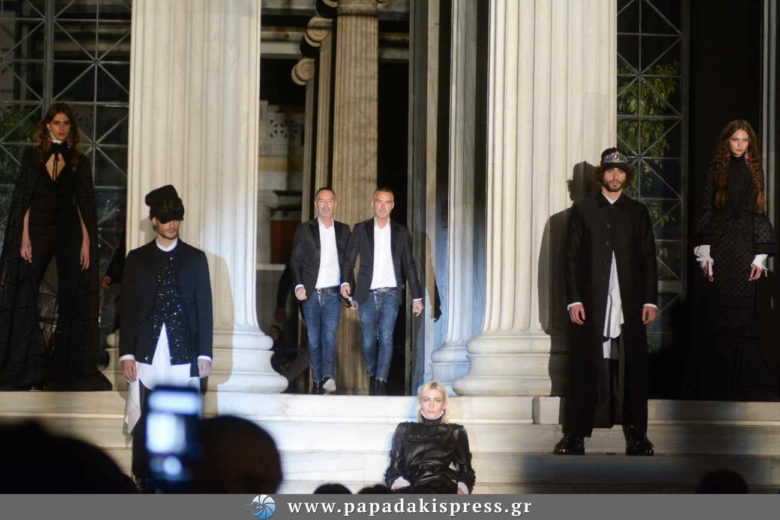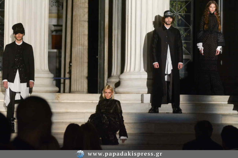 Η εντυπωσιακή, εξωτερική σκάλα του Ζαππείου Μεγάρου μετατράπηκε σε ένα live fashion show installation για την παρουσίαση της συλλογής “Glunge”, όπου μοντέλα πόζαραν με τις εντυπωσιακές δημιουργίες των σχεδιαστών.