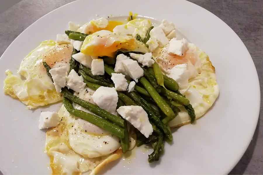 Αυγουλάκια τηγανητά με σπαράγγια και φέτα, που είναι πολύ εύκολο και στην παρασκευή του.
