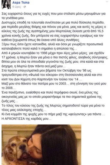 Όπως χαρακτηριστικά σχολίασε η ίδια κάτω από τη φωτογραφία, η Μυρτώ τα τελευταία 17 χρόνια ήταν η βασίλισσα της καρδιάς της και η Άσπα Τσίνα θέλησε να μοιραστεί με τους διαδικτυακούς φίλους της τα έντονα συναισθήματα για το χαμό της τετράποδης φίλης της. Διαβάστε παρακάτω τα συγκινητικά λόγια της τραγουδίστριας.