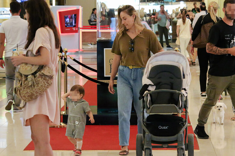 Εμείς τη συναντήσαμε σε γνωστό εμπορικό κέντρο των Βορείων προαστείων, να κάνει τη βόλτα και τα ψώνια της μαζί με τη μικρή Αλεξάνδρα, ντυμένη casual εμφάνιση και χωρίς μακιγιάζ.