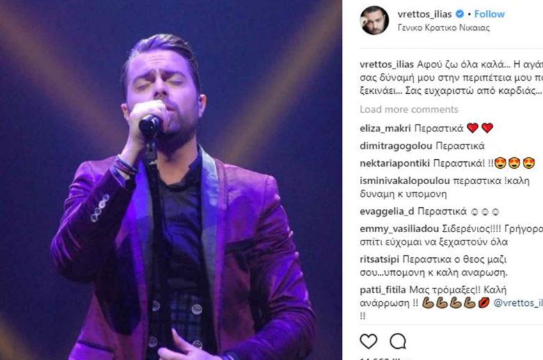 Ο τραγουδιστής, αν και βρίσκεται σε πολύ δύσκολη θέση, έκανε την πρώτη του ανάρτηση στo Instagram, ανεβάζοντας μια φωτογραφία του και ευχαριστώντας παράλληλα τους φίλους του για το ενδιαφέρον και τη στήριξή τους. «Αφού ζω όλα καλά… Η αγάπη σας δύναμή μου στην περιπέτεια μου που ξεκινάει… Σας ευχαριστώ από καρδιάς…» έγραψε ο Ηλίας Βρεττός στη λεζάντα της φωτογραφίας.