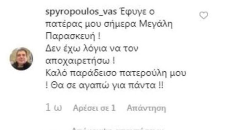 Η Κωνσταντίνα Σπυροπούλου, φαίνεται να μην διανύει την καλύτερη περίοδο της ζωής της, καθώς λίγες ώρες πριν, πέθανε ο πολυαγαπημένος της παππούς.
