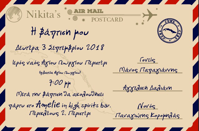 Με μια καρτ ποστάλ από την Κούβα, ο Μάνος Παπαγιάννης και η Αγγελική Δαλιάνη, προσκαλούν συγγενείς και φίλους στη βάπτιση του γιου τους.
