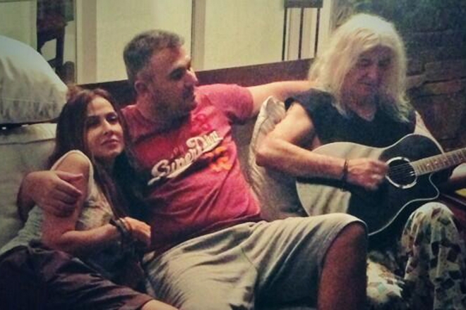 Στη φωτογραφία που ανέβηκε στο διαδίκτυο, βλέπουμε τον Αντώνη Ρέμο αγκαλιασμένο με την Άννα Βίσση και δίπλα τους τον Νίκο Καρβέλα να… πειραματίζεται με μια κιθάρα!