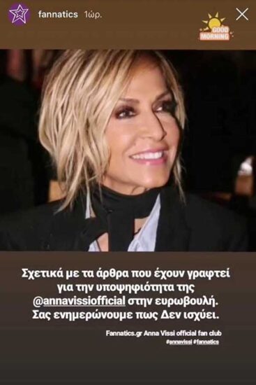 Ωστόσο κάτι τέτοιο φαίνεται να διαψεύδεται από το περιβάλλον της καλλιτέχνιδος, με το επίσημο fan club της μάλιστα να αναφέρει σε ανάρτησή του πως «σχετικά με άρθρα που γράφτηκαν για υποψηφιότητα της Άννας Βίσση στην Ευρωβουλή, σας ενημερώνουμε πως κάτι τέτοιο δεν ισχύει». Δεν αποκλείεται μάλιστα το επόμενο διάστημα να υπάρχει και σχετική διάψευση και από το ίδιο το κόμμα.
