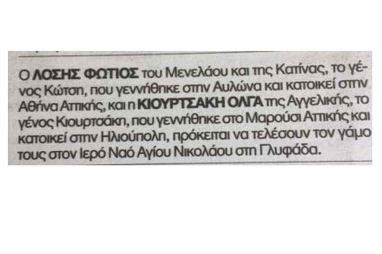 «Ο Λόσης Φώτης του Μενελάου και της Κατίνας, το γένος Κώτση, που γεννήθηκε στην Αθήνα Αττικής και η Κιουρτσάκη Όλγα της Αγγελικής, το γένος Κιουρτσάκη, που γεννήθηκε στο Μαρούσι Αττικής και κατοικεί στην Ηλιούπολη, πρόκειται να τελέσουν τον γάμο τους στον Ιερό Ναό Αγίου Νικολάου στη Γλυφάδα».