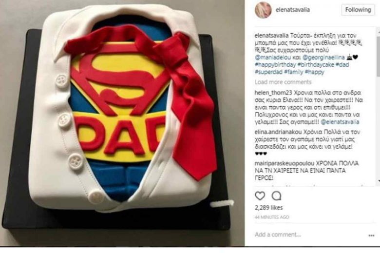 Η Έλενα Τσαβαλιά ανέβασε, μάλιστα, στο προφίλ της στο instagram μία φωτογραφία της τούρτας-έκπληξης, σχολιάζοντας: «Τούρτα-έκπληξη για τον μπαμπά μας που έχει γενέθλια».