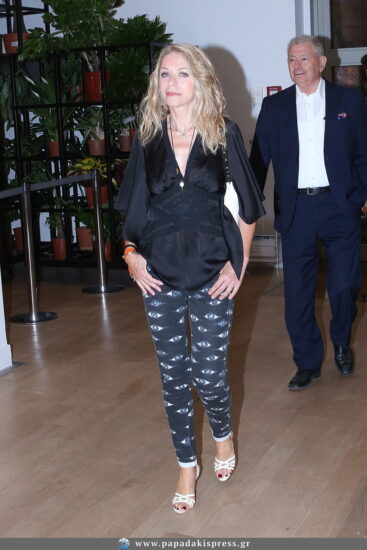 Η Έλλη Στάη έκανε αίσθηση με την εμφάνισή της, έχοντας επιλέξει ένα εντυπωσιακό παντελόνι, μαύρη σατέν μπλούζα , λευκά πέδιλα και λευκή τσάντα ώμου.