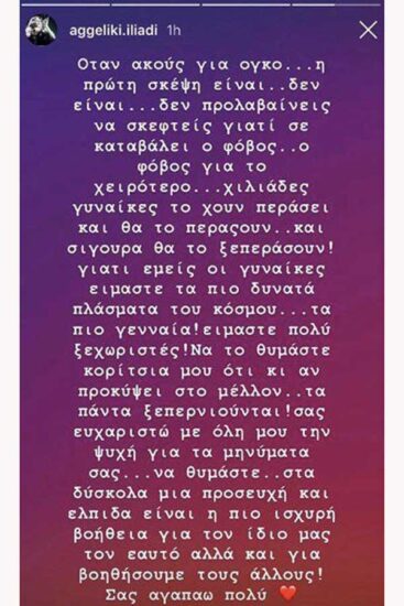 Η Αγγελική Ηλιάδη, αποφάσισε να μοιραστεί την περιπέτεια που πέρασε, με τους διαδικτυακούς της φίλους στο Instagram με στόχο να δώσει δύναμη σε όλο τον κόσμο: «Όταν ακούς για όγκο, η πρώτη σκέψη είναι… δεν είναι, δεν προλαβαίνεις να σκεφτείς γιατί σε καταβάλει ο φόβος για το χειρότερο. Χιλιάδες γυναίκες το έχουν περάσει και θα το περάσουν και σίγουρα θα το ξαναπεράσουν! Γιατί εμείς οι γυναίκες είμαστε τα πιο δυνατά πλάσματα του κόσμου, τα πιο γενναία. Είμαστε πολύ ξεχωριστές! Να το θυμάστε κορίτσια μου ότι κι αν προκύψει στο μέλλον, τα πάντα ξεπερνιούνται! Σας ευχαριστώ με όλη μου την ψυχή για τα μηνύματά σας. Να θυμάστε στα δύσκολα μια προσευχή και ελπίδα είναι η πιο ισχυρή βοήθεια για τον ίδιο μας τον εαυτό αλλά και για να βοηθήσουμε τους άλλους. Σας αγαπώ πολύ».