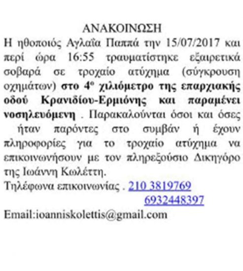 Μέσω του πληρεξούσιου δικηγόρου της, Ιωάννη Κωλέττη, απεύθυνε έκκληση σε όλους όσοι ήταν παρόντες στο συμβάν ή έχουν πληροφορίες για το τροχαίο ατύχημα που συνέβη τη 15η Ιουλίου, στις 16:55, στο 4ο χιλιόμετρο της επαρχιακής οδού Κρανιδίου-Ερμιόνης να επικοινωνήσουν μαζί του στα τηλέφωνα 2103819769 και 6932448397.