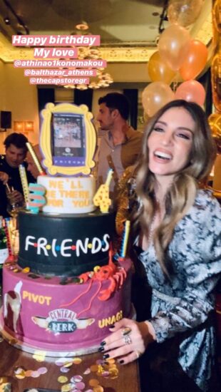 H Αθηνά Οικονομάκου, που έκλεισε τα 34 της χρόνια, λαμπερή και γεμάτη κέφι, έχοντας δίπλα της τον αγαπημένο σύζυγό της Φίλιππο Μιχόπουλο και τους φίλους της έσβησε τα κεράκια στην τούρτα των γενεθλίων της, μια τούρτα υπερπαραγωγή με θέμα “Friends”– την πολυαγαπημενη σειρά τα “Φιλαράκια”.