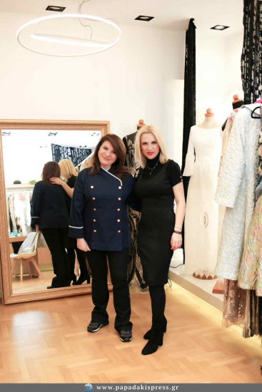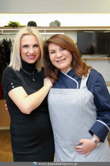 Η Όλγα Καραβερβέρη υποδέχθηκε στο ατελιέ της στο Κολωνάκι, την Πρέσβη Γαστρονομίας των ελληνικών νησιών Αργυρώ Μπαρμπαρίγου, που ήρθε να παραλάβει την μαγειρική ποδιά που δημιούργησε η γνωστή σχεδιάστρια μόδας, ειδικά για εκείνη.