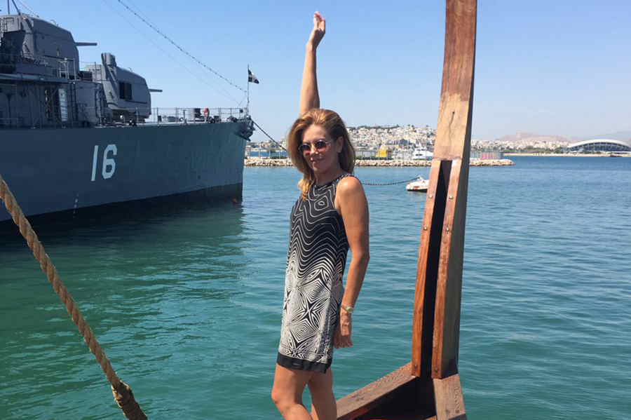 Η παρουσιάστρια και μουσικός, επισκέφτηκε την Τρίτη 17 Ιουλίου την Τριήρη Ολυμπιάς, η οποία είναι αγκυροβολημένη στο Τροκαντερό. Ενώ όμως βρισκόταν στο ιστορικό πλοίο, μια στιγμή αβλεψίας ή κατά άλλους σε μια προσπάθεια να προστατεύσει κάποιους που βρίσκονταν πολύ κοντά στον προβλήτα, έπεσε στη θάλασσα χωρίς ωστόσο να χτυπήσει.