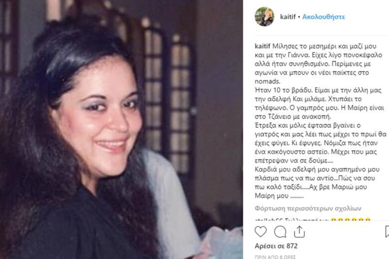 Καρδιά μου αδελφή μου αγαπημένο μου πλάσμα πως να πω αντίο… Πώς να σου πω καλό ταξίδι… Αχ βρε Μαριώ μου Μαίρη μου…», έγραψε στο Instagram η Καίτη Φίνου.