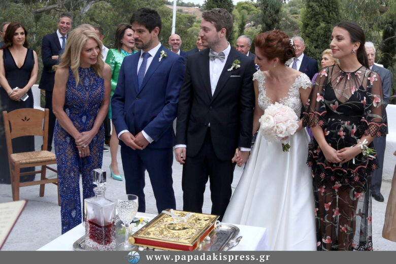 Το ζευγάρι ενώθηκε χθες με τα ιερά δεσμά του γάμου σε μια ρομαντική τελετή στον Ιερό Ναό της Αγίας Τριάδας Καλυβίων. Τους μελλόνυμφους συνόδευσαν μέχρι τα σκαλιά της εκκλησίας οι μητέρες τους. Ο γαμπρός έφτασε νωρίτερα ως είθισται, συνοδευόμενος από την απαστράπτουσα Έλλη Στάη, ενώ η νύφη έφτασε λίγο αργότερα με μια λευκή cabrio Pontiac έχοντας στο πλάι της τη μητέρα της Βένια Παπαθανασοπούλου.