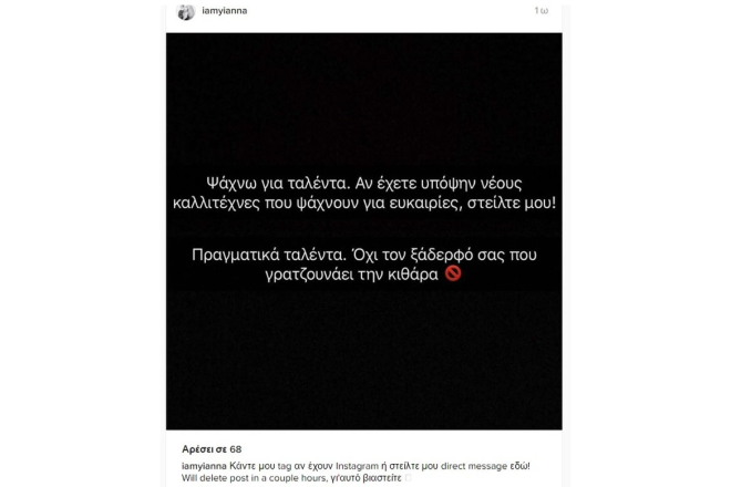 Η όμορφη επιχειρηματίας πλέον δουλεύει σε εταιρεία παραγωγής και κυνηγάει νέα ταλέντα. Με αφορμή την έναρξη της νέας σεζόν , η Γιάννα Τερζή ζήτησε από τους διαδικτυακούς της φίλους να της συστήσουν ταλέντα.